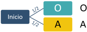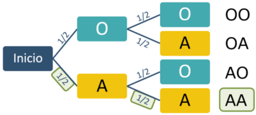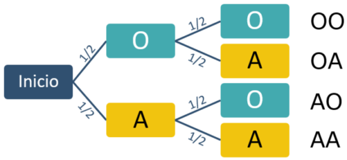 ¿Cuál sería la probabilidad de que una pareja con dos hijos tenga uno de cada sexo? Hay 2 casos favorables ($OA$ y $AO$) de 4 casos totales. Como todos los casos tienen la misma probabilidad, entonces la probabilidad de que los dos hijos sean de sexos distintos será $2/4$. Es decir, un $50\%$.