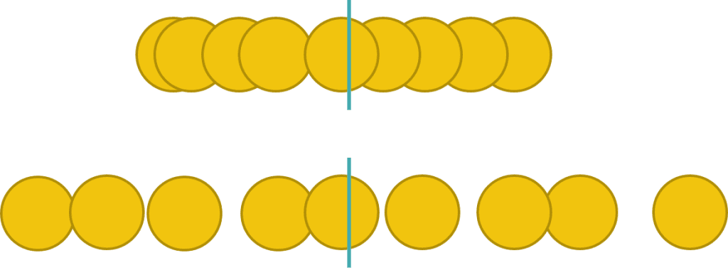Para calcular la varianza (escrita como $V[X]$ o $\sigma^2$), vemos a qué distancia está cada valor de la esperanza y la elevamos al cuadrado. Por ejemplo, en el caso del dado, el resultado 1 está a distancia $2.5$ de la esperanza ($1-3.5=-2.5$). Elevamos el resultado al cuadrado: $(-2.5)^2=6.25$.