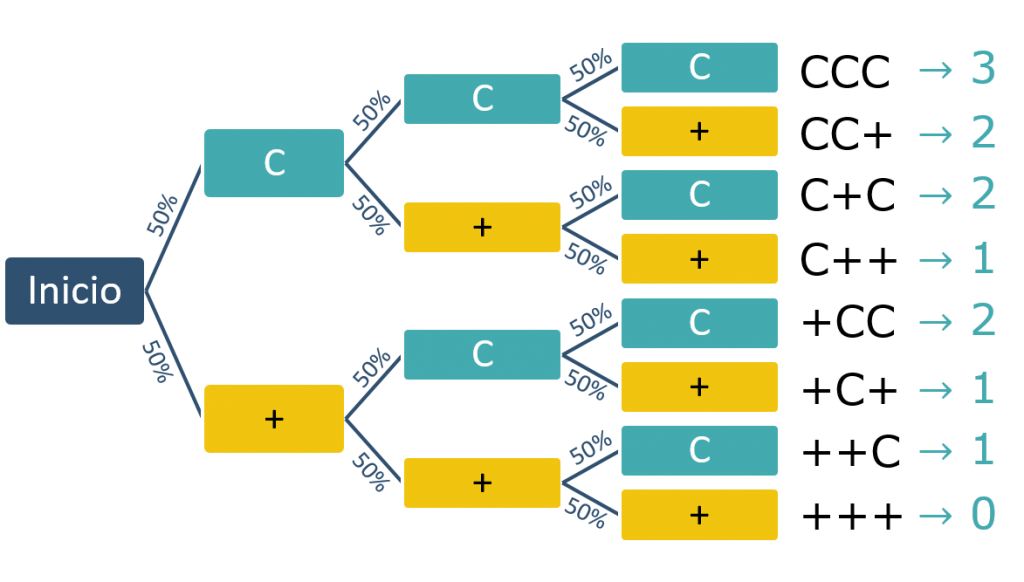 La función de masa de probabilidad (también conocida como función puntual o función de cuantía) asigna una probabilidad a cada posible valor de la variable aleatoria discreta. Por ejemplo, al tirar 3 monedas, el número de caras puede ser 0, 1, 2 o 3. Podemos ver su diagrama de árbol con los posibles resultados y el número de caras.