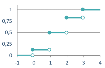 Por lo tanto, la función de distribución es constante, excepto en aquellos valores a los que la función de masa asigna una probabilidad (0, 1, 2 y 3 en este ejemplo), donde tiene saltos crecientes. Se ve mejor al representar la función de distribución gráficamente.