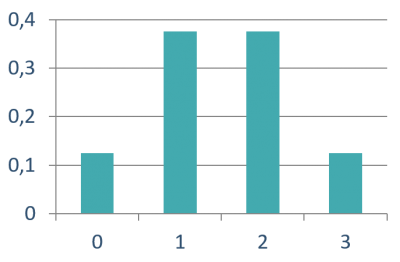 ¿Qué probabilidad asigna la función de masa a cualquier otro valor distinto de los listados (0, 1, 2 y 3)? Cero. Por ejemplo, es imposible que el número de caras sea 1,2: $P(\textrm{NumCaras}=1,2)=0$