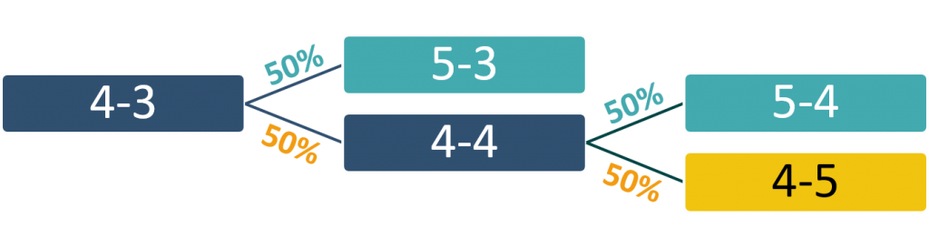 Cuando se interrumpe la partida, el primer jugador va ganando 4 a 3 a su rival. Realicemos un diagrama de árbol para ver todas las combinaciones hasta que uno de los dos llega a 5 puntos y la probabilidad de cada una de las opciones.